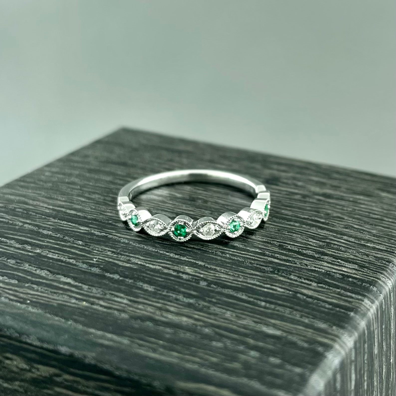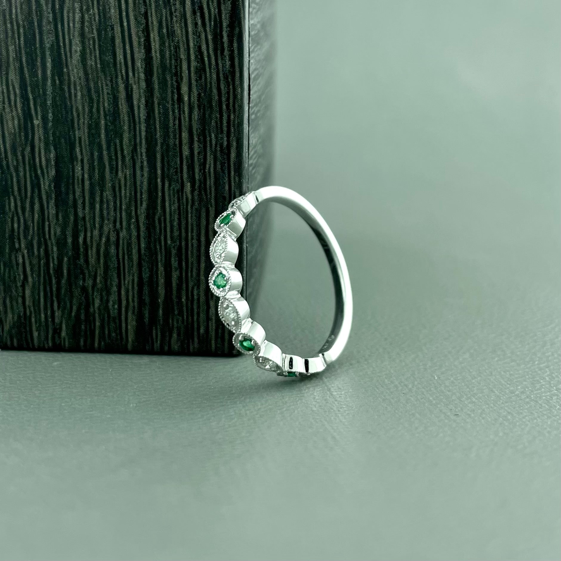 14k White Gold Emerald .07 Total and Diamond .09 Total Stackable Band