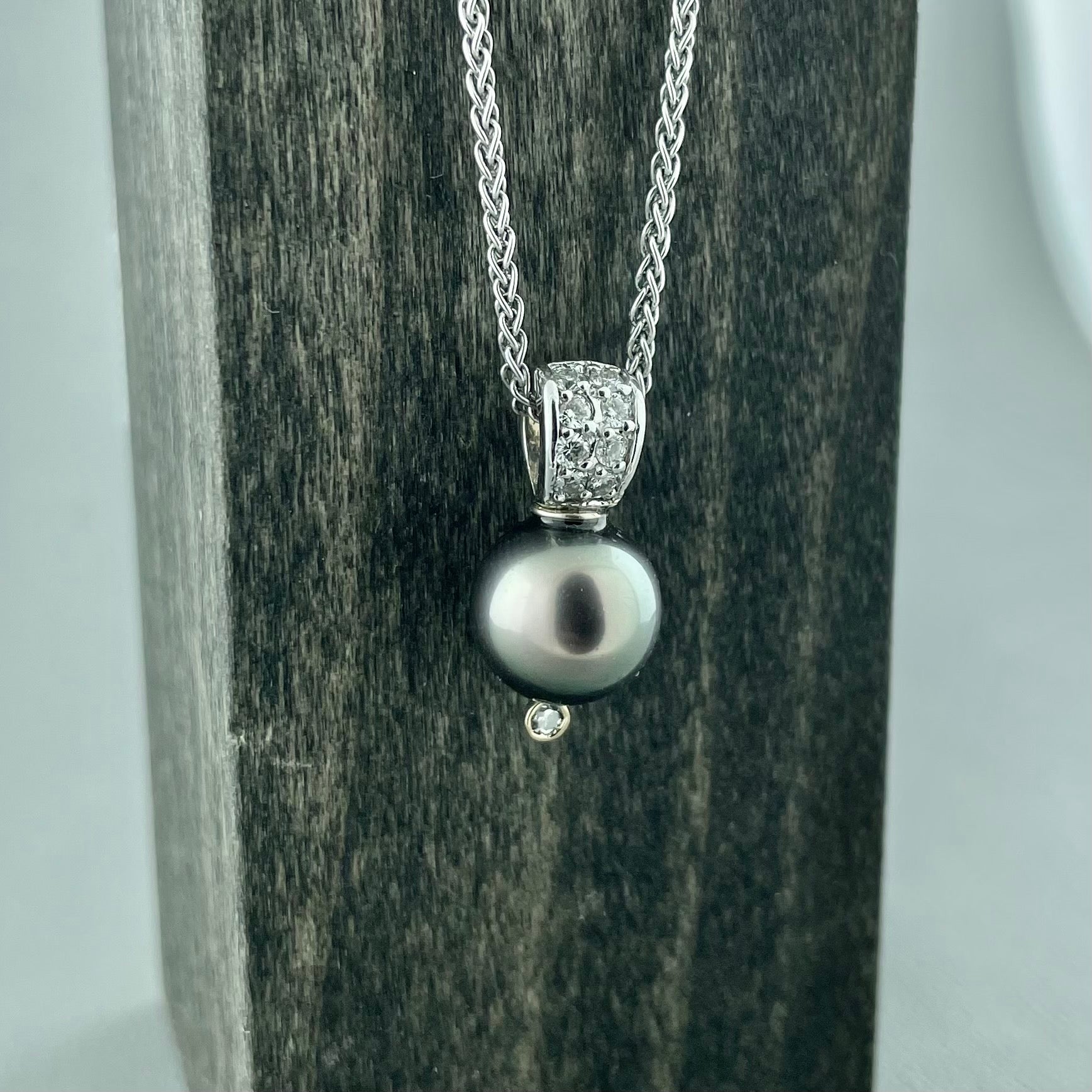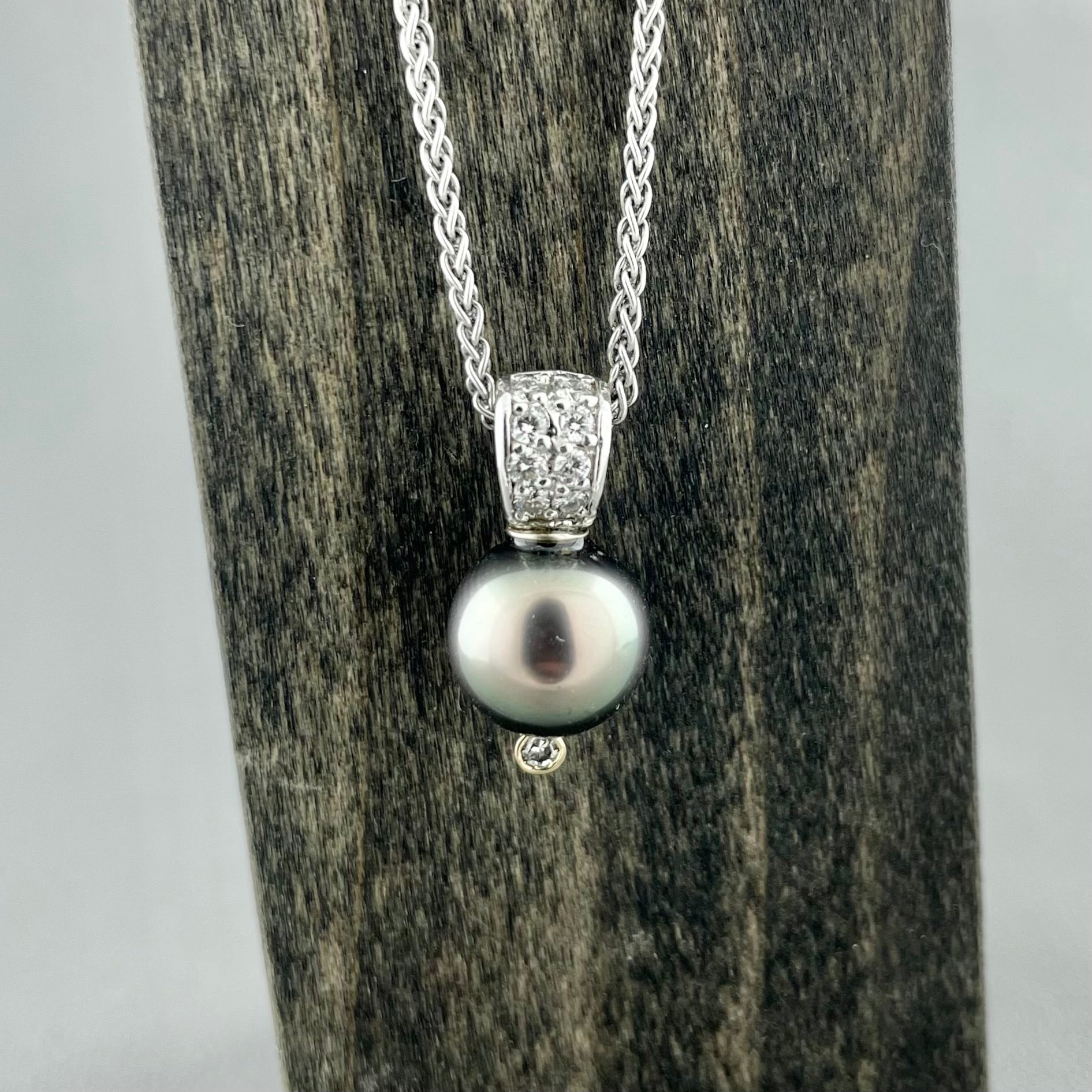 14k White Gold Tahitian Pearl & Diamond Pendant with Wheat Chain